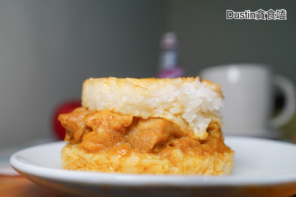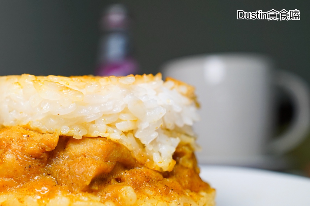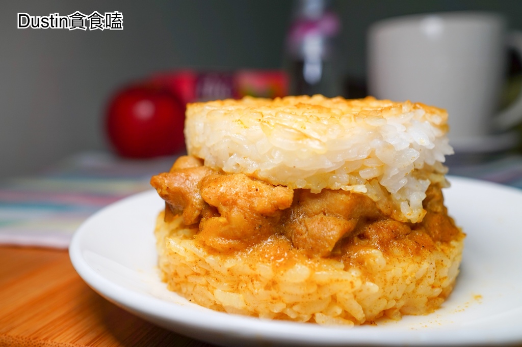 內餡咖哩雞肉部分,部分咖哩醬汁已透入米堡內